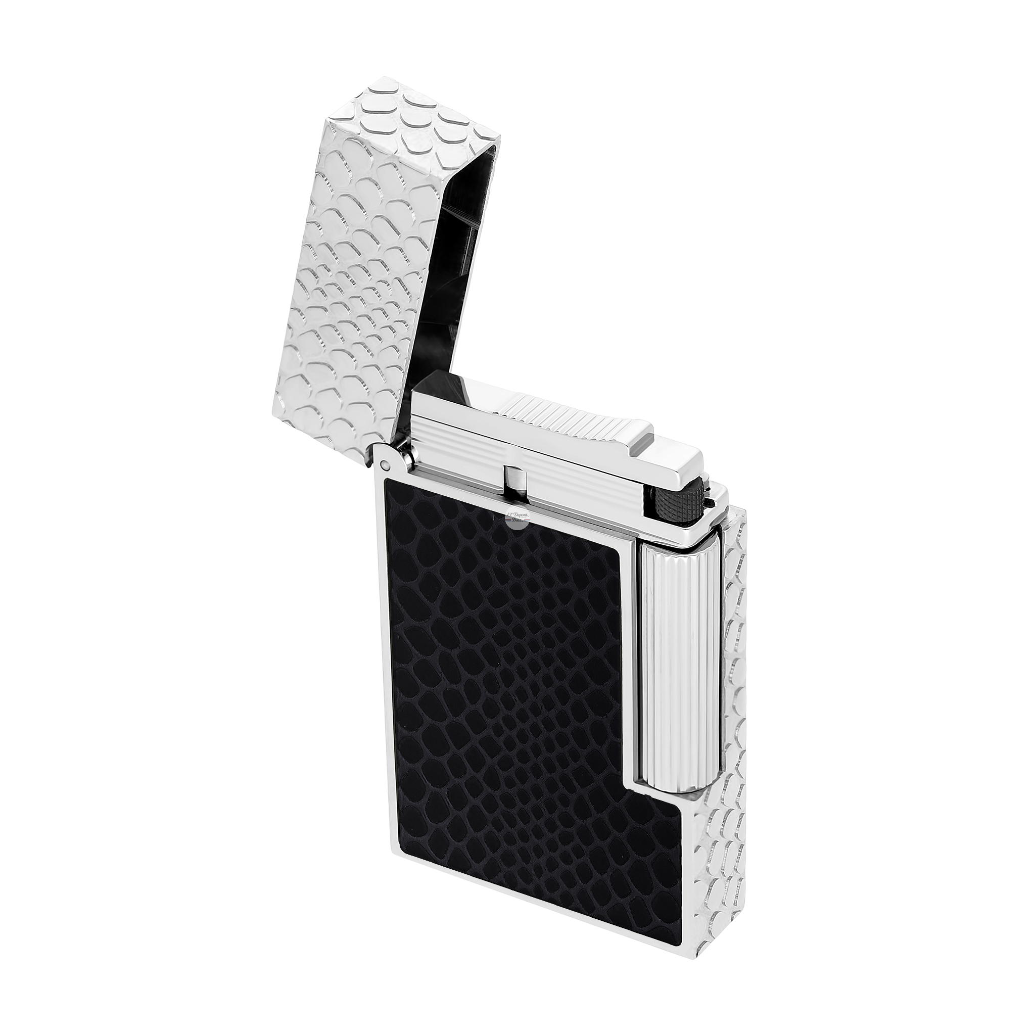 Ligne 2 Cling lighter, guilloche under lacquer, black Snake skin motif, palladium finish.